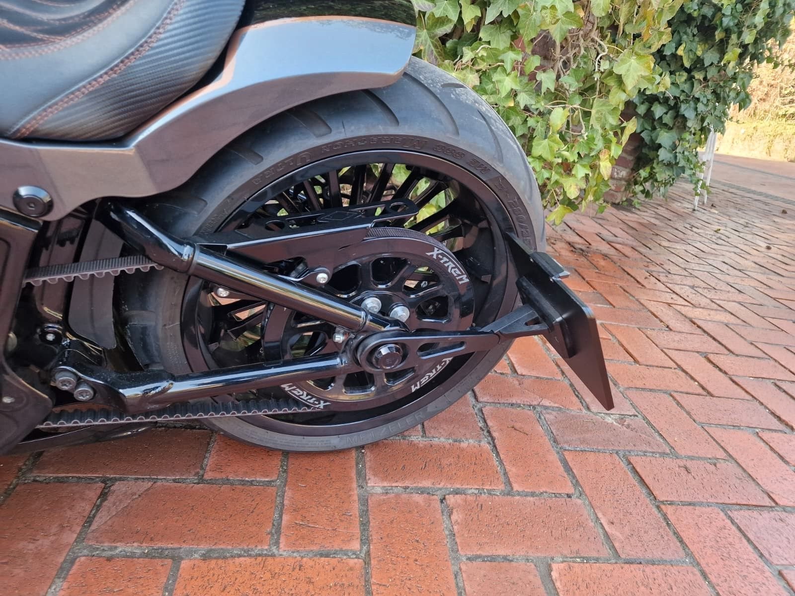 280/35 R 18 Breitreifenumbau by X-Trem Heckfender Stahl X-Trem LED Stripe Blinker und Rücklicht unter dem Fender Kodlin Vorderradschutzblech Stahl Kess-Tech Komplettanlage mit Krümmern X-Trem Leistungskit Stage 2 Nockenwelle (ca. 125 PS) in Verbindung mit (siehe folgend) Powervision Mapping Billet Stößelführungen Verstärktes Nockenwellenlager Gabelcoverkit komplett schwarz Wave Bremsscheiben vorne und hinten Bugspoiler Aggressor Rahmenspoiler hinten Scheinwerferverkleidung Rahmencover Avenger Kodlin Tieferlegung Derbycover Torque Seitlicher Kennzeichenhalter aus Alu gefräst mit Einschubkennzeichenplatte Thunderbike Achscover vorne Schwingenachscover Wunderkind Achscover hinten Design Riemenschutz kurz Designspiegel in Carbonoptik Popup Tankdeckel schwarz Designsitz angefertigt (Alcantarasitzfläche mit Diamantziernähten, und Rauh sowie Carbonkunstleder eingefasst) Alle Chrom und gänzenden Aluteile wurden schwarz hochglänzend pulverbeschichtet.